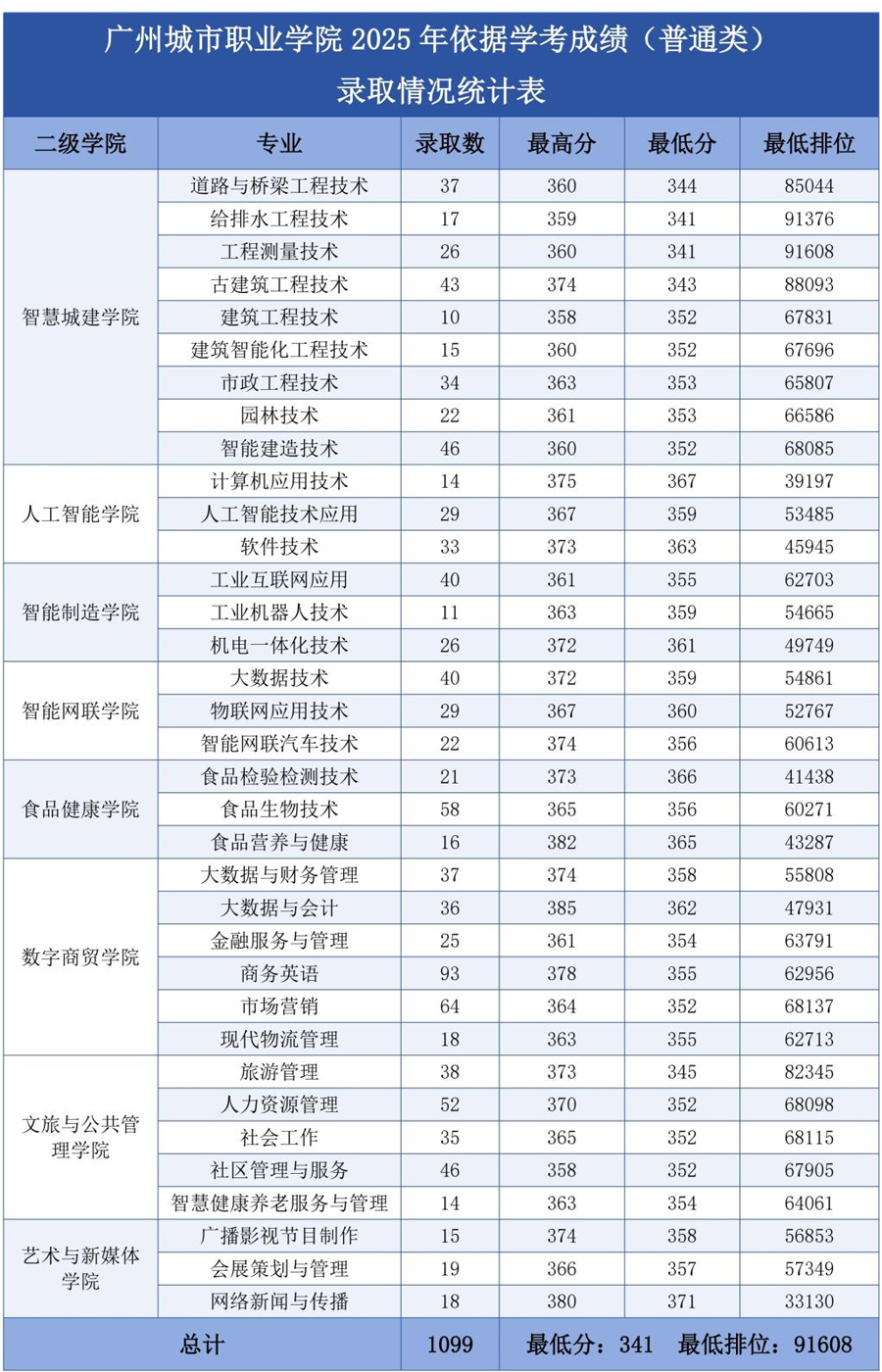广州城市职业学院2025年依据学考成绩(普通类)各专业录取情况