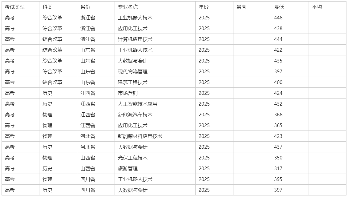 江西现代职业技术学院2025年江西省秋季高招各专业录取情况表