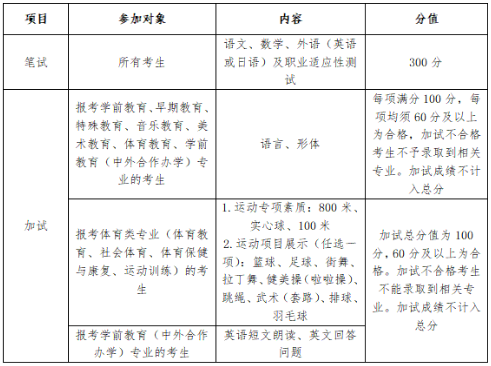 1.校测对象:所有填报我校志愿的考生均须参加校测笔试,其中报考师范类专业(早期教育、学前教育、特殊教育、音乐教育、美术教育、体育教育、学前教育(中外合作办学))、体育类专业(体育教育、社会体育、体育保健与康复、运动训练)和学前教育(中外合作办学)专业的考生须参加专业加试,艺术类考生的专业省统考成绩计入总分。