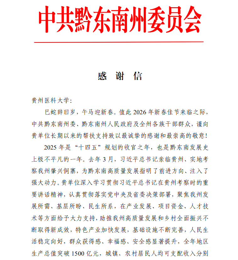 近日,贵州医科大学收到中共黔东南州委、黔东南州人民政府,以及中共三穗县委、三穗县人民政府发来的感谢信,两份感谢信分别代表全州各族干部群众、全县23万各族人民,向贵州医科大学长期以来的倾情帮扶、大力支持致以最诚挚的感谢和最崇高的敬意。