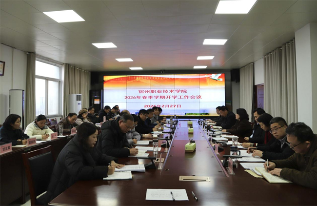 2月27日,宿州职业技术学院召开2026年春季学期开学工作会议,传达学习全市“双招双引”暨“干部作风提升年”动员大会精神,切实强化作风提升,系统谋划部署,扎实做好春季学期各项准备工作,为全年工作实现良好开局打牢基础。党委书记连琦出席并讲话,党委副书记、院长陈东旭主持会议,副书记赵开兵,领导班子成员赵素华、丁上山、李进步、李斌、魏万杰,院属各单位党政主要负责人参加会议。
