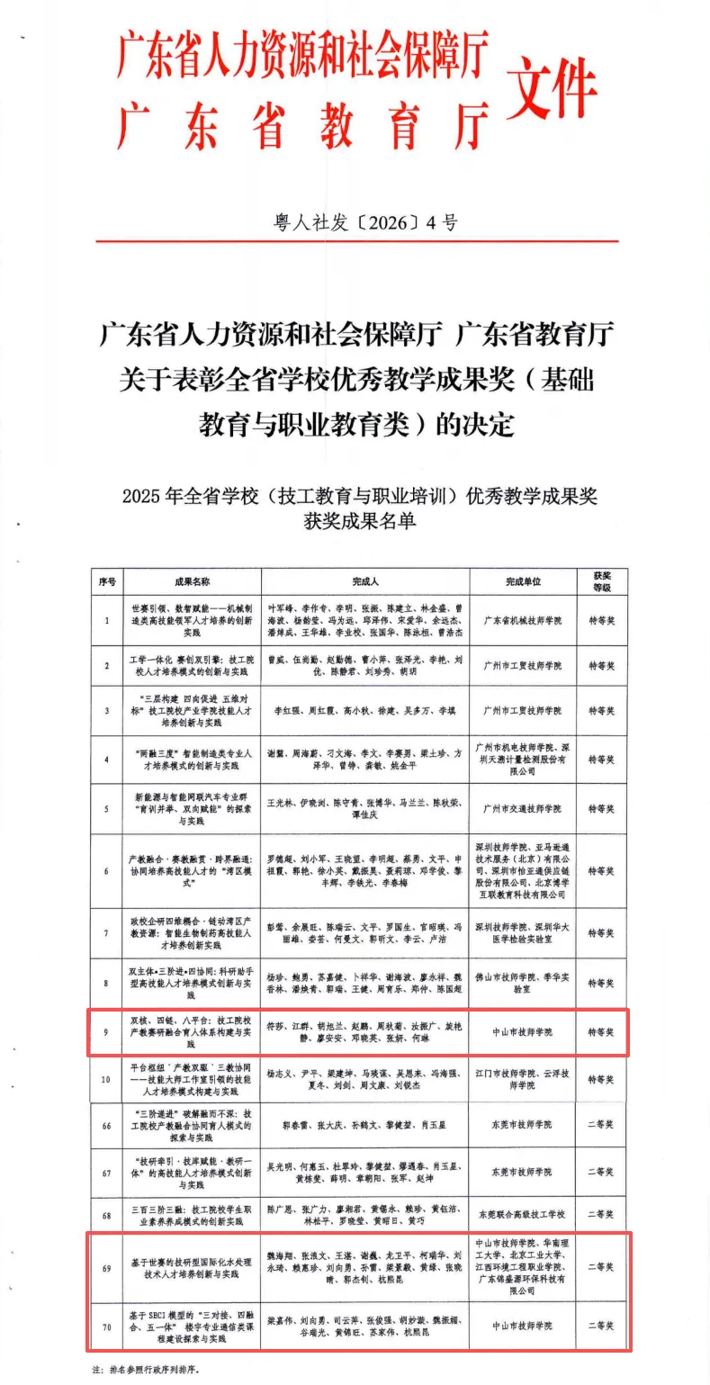近日,2025年广东省学校优秀教学成果奖(技工教育和职业培训类)名单正式公布。中山市技师学院申报的三项教育教学成果悉数上榜,分获特等奖1项、二等奖2项,成为本届评选中表现尤为亮眼的院校之一。值得关注的是,三项成果均深度融合世界技能大赛的先进标准与资源,展现出我院在推动产教融合、促进世赛成果转化方面走出了行之有效的步伐。