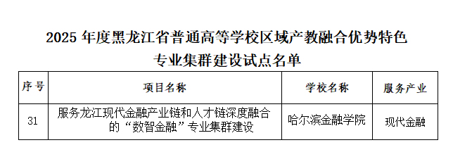 在区域产教融合优势特色专业集群建设试点类别中,哈尔滨金融学院“服务龙江现代金融产业链和人才链深度融合的‘数智金融’专业集群建设项目”成功入选。该项目立足学校办学特色,通过构建产教融合赋能的应用型人才培养新生态,推动人才培养与产业发展深度融合,服务区域经济社会高质量发展。