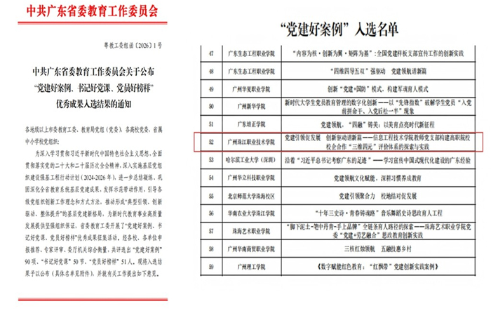 此次入选省委教育工委“党建好案例”,彰显了广州珠江职业技术学院基层党组织在攻克职教改革难关、助推发展中的先锋本色,也是对广州珠江职业技术学院基层党组织工作成效的高度肯定与有力鞭策。学校将以此为契机,持续深化“党建+业务”融合机制,推广“三维四元”评价体系经验,完善数字党建平台功能,强化“双带头人”队伍建设,推动形成“党建引领、产教融合、特色发展”的职业教育新格局,以高质量党建引领学校事业高质量发展,为区域经济社会发展输送更多“即用型”高素质技术技能人才。(文/图 阮静熙)