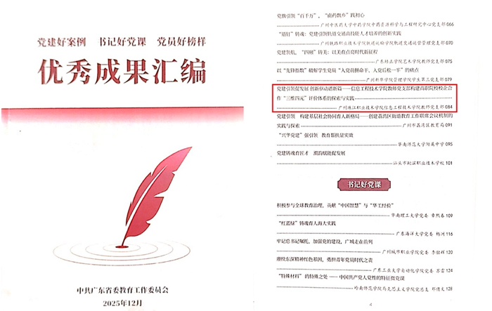 1月13日,中共广东省委教育工委公布了“党建好案例、书记好党课、党员好榜样”优秀成果入选名单,广州珠江职业技术学院信息工程技术学院教师党支部报送的《党建引领促发展 创新驱动谱新篇——构建高职院校校企合作“三维四元”评价体系的探索与实践》成功入选“党建好案例”。