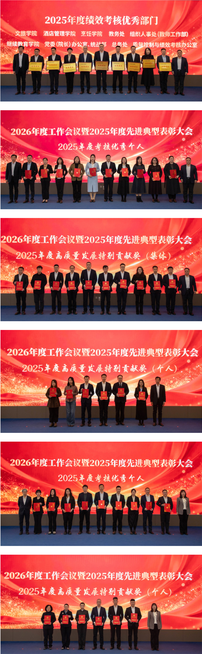 会议对2025在学校改革发展中涌现出的先进集体和个人进行了表彰,党委领导班子成员为受表彰对象颁奖。本次表彰活动以“奉献青酒管 榜样海斯曼”为主题,突出实干实绩,创新设置了“常规考核、特别贡献奖、高质量发展典型成果”三个表彰板块。通过分类评价、精准激励,为学校高质量发展树立了鲜明的价值导向。