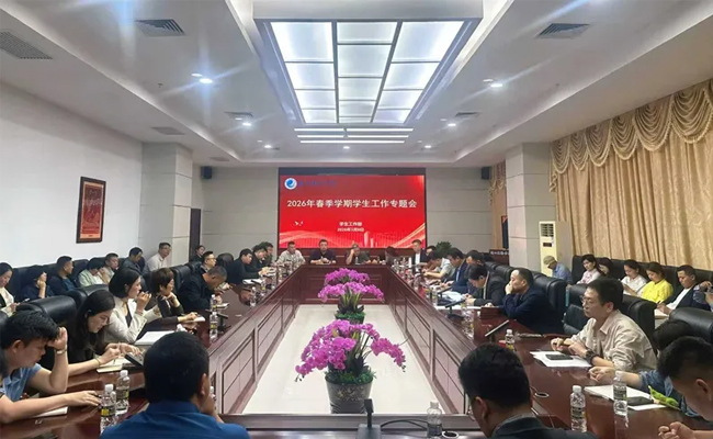 为贯彻落实董事长讲话要求、全面推动“十一条”落地见效,根据陈啸校长工作报告精神和学校年度工作总体部署,扎实推进2026年春季学期学生工作高质量开展,3月6日下午,海口经济学院在图书馆报告厅召开春季学期学生工作专题会议。副校长霍永洲出席会议,学生工作部(艺术团)、校团委、保卫处(武装部)、学生宿舍管理处、心理健康教育与咨询中心等部门助理以上干部,各二级学院(系)党总支书记、副书记、团委书记等50余名学工骨干参加会议。会议由校长助理、学工部主任汤华主持。
