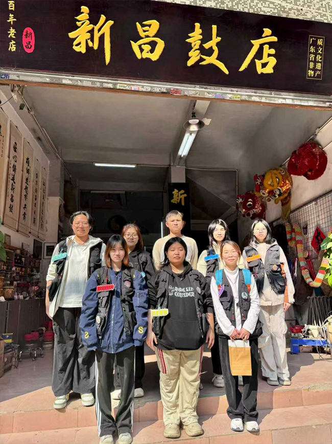 在石龙镇新昌鼓老铺里,师生们触摸着传承五六代的鼓身。厚重的木质承载着时光的重量,咚咚鼓声里蕴含着东莞人民的美好祈愿。从满月祝福到节庆欢腾,鼓声早已融入城市的生活肌理。当鼓槌敲响的那一刻,师生们听见了历史的回响,也感受到了文化传承的坚实力量。