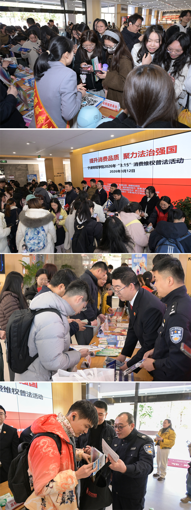 “直播间买到假货该怎么维权?”“预付卡商家跑路如何追回损失?”3月12日,宁波财经学院校园内热闹非凡,一场主题为 “提升消费品质・聚力法治强国” 的 2026 年“3・15”消费维权普法活动火热开展。学校携手海曙区人民法院、人民检察院等 14 家单位,通过趣味答题、现场咨询、案例讲解等多样形式,为全校师生奉上了一份干货十足的法治维权“大礼包”。