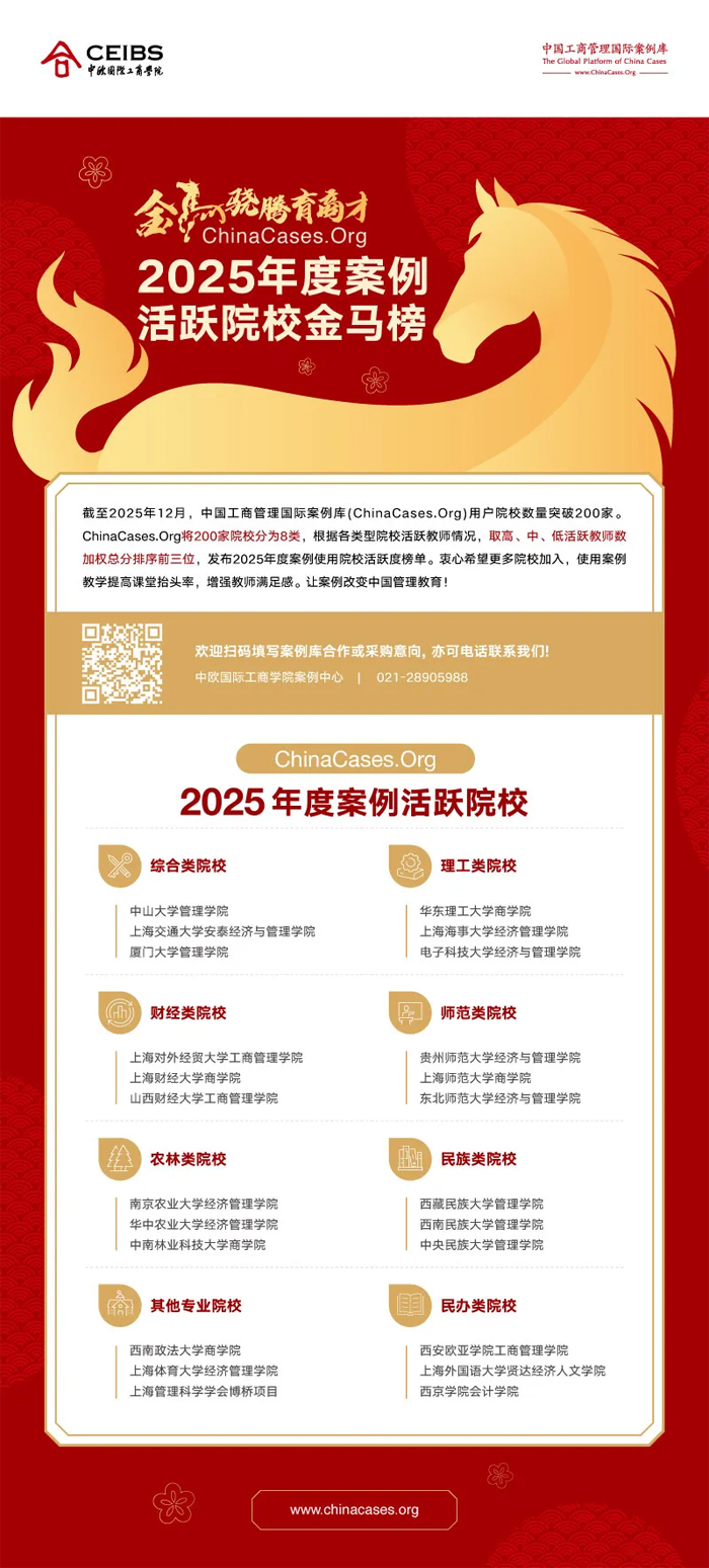 中国工商管理国际案例库(中欧案例库)是国内顶尖、国际知名的商学案例资源平台,其“活跃院校金马榜”以案例使用规模、教师参与度、案例开发质量等核心指标综合评定,是衡量高校商科案例教学实力的重要标杆。截至2025年底,工商管理学院全年使用中欧案例689篇次,覆盖学生8805人次,案例教学深度与广度持续提升。