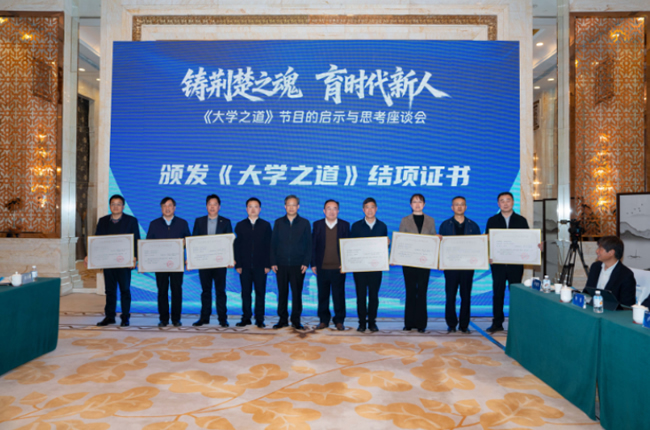 国家广播电视总局、中国电视艺术家协会、中央广播电视总台、中国广播影视报刊协会有关领导和负责人,复旦大学、中国人民大学等高校专家学者,省委宣传部、省教育厅、省社科联相关领导,以及参与《大学之道》第四季项目的7所湖北高校领导、师生代表共同参会。会上,主办方为各参与高校颁发了结项证书。与会领导、专家学者及行业、高校代表围绕新时代大学之道、立德树人路径探索、高校思政育人赋能及项目提质升级等议题,展开精准指导与深入研讨。