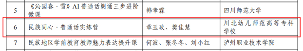 近日,四川省教师发展中心公布首批普通话优质课程教学资源遴选结果,川北幼儿师范高等专科学校章玉玫、樊佳慧两位老师联合制作的《民族同心·普通话实练营》系列课程成功入选。该课程资源将纳入全省语言文字教学资源库,定向免费开放给民族地区、革命老区重点人群自主选学,为推广普及国家通用语言文字、助力语言教育均衡发展贡献学前力量。