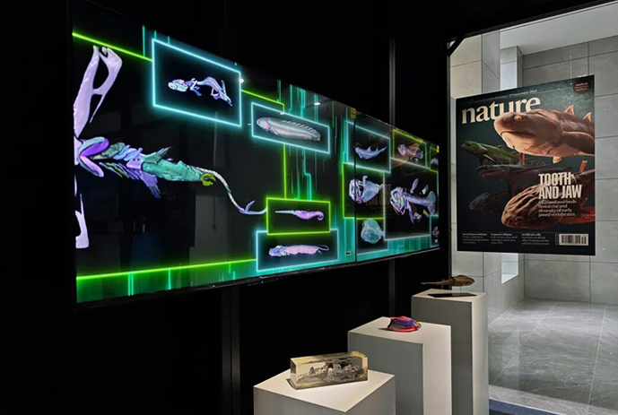 本次展览特邀中国科学院古脊椎所朱敏院士团队合作,依托曲靖地区丰富的古生物化石资源,融合前沿科研成果与人工智能技术,通过CT扫描、三维建模及沉浸式可视化手段,生动重现了四亿年前的远古曲靖湾。
