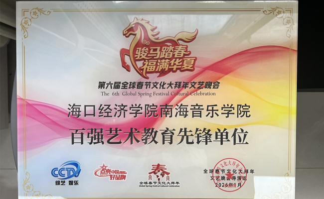 由全球春节文化大拜年导演组主办、春节文化申遗推广办公室指导、春节期间在中央广播电视台CCTV高清频道播出的2026年"骏马踏春,福满华夏"第六届全球春节文化大拜年文艺晚会中,海口经济学院南音学子李玥儿、马煜凯的精彩表演体现学院扎实的艺术教育实力,南海音乐学院荣获百强艺术教育先锋单位称号。