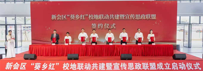 仪式现场,广州华商职业学院、广州软件学院、广州华立学院、广东南方职业学院分别与区委宣传部、区委组织部、区委统战部、区教育局、区科工商务局、区人力资源和社会保障局、区文化广电旅游体育局、区委党校、团区委等9个区直属单位,圭峰会城、大泽镇、司前镇、罗坑镇、双水镇、崖门镇、沙堆镇、古井镇、三江镇、睦洲镇、大鳌镇等11个镇街签订《新会区“葵乡红”校地联动共建暨宣传思政联盟建设结对协议》。