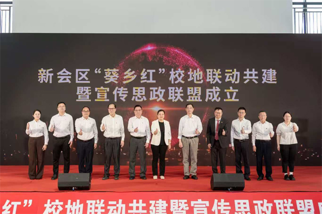 他强调,推进新会区“葵乡红”校地联动共建、构建校地宣传思政联盟是落实教育强国战略、办人民满意教育的战略举措,旨在搭建理论共学、资源共享、活动共举、成果共享的协同育人平台,推动大中小学思政一体化建设,让思政教育走出校园、扎根基层,让红色基因、侨乡精神在葵乡大地代代相传。他寄语青年学子用脚步丈量江门大地,用眼睛发现侨乡精神,用耳朵倾听人民呼声,用内心感应时代脉搏,成长为扎根湾区、服务中国式现代化建设的时代新人,让“红色思政之花”在葵乡大地绚丽绽放。