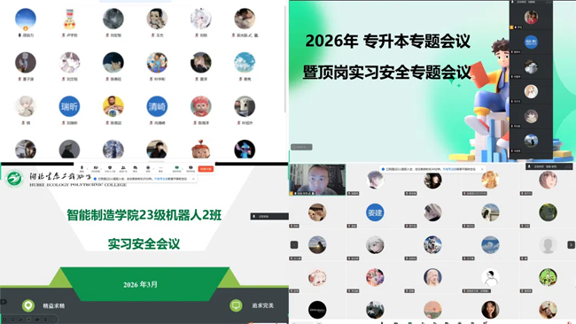 为进一步落实2026年学院工作计划,贯彻落实学生工作座谈会精神,强化实习期间的安全管理与学业支持,湖北生态工程职业技术学院智能制造学院于2026年3月面向全体大三学生组织召开了实习指导线上会议。本次会议以刚刚结束的湖北省普通专升本考试为核心议题,旨在通过政策宣贯、安全排查与精准指导,为学生实习与升学保驾护航。全院17名实习指导教师深入参与,覆盖3个专业11个班级,确保指导工作全员无死角。