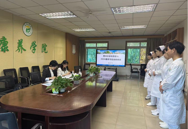 为保障选拔工作规范、有序开展,康养学院严格按照华西医院选拔方案要求,筛选推荐了近60名学生进入面试,均为品学兼优、形象气质良好,且预计能在2027年7月如期取得本科学历毕业证的优秀学子,并做好面试全流程筹备工作。面试现场,参选学生统一身着护士服,以良好的职业形象和精神面貌依次面试。两名面试专家结合学生自我介绍和个人资料进行综合提问,全面考察学生的专业基础、应变能力、职业认知与沟通表达能力。经过3小时的严格面试,专家现场确定了30名录取护生名单,录取结果将由我院正式公布。下一步,入选的康养学子将如期进入华西医院开启护理实习生涯,接受华西规范的临床带教。