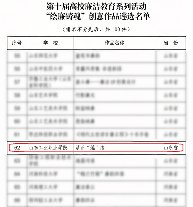 近日,教育部公布第十届高校廉洁教育系列活动结果,山东工业职业学院纪委选送的宋振海等同志创作的作品《清正“莲”洁》成功入选“绘廉铸魂”创意优秀作品名单。