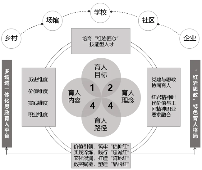 为了全面落实立德树人根本任务,充分发挥红岩精神的育人价值,重庆电子科技职业大学党委着眼高质量实施新时代立德树人工程,将本地红色文化资源“红岩精神”作为思政育人核心元素,融入职业教育多场域人才培养全过程。秉持“红岩精神”时代价值与“工匠精神”职业要求深度融合的育人理念,锚定培养具有家国情怀、红岩底色、匠心技艺、创新精神的新时代高技能人才、能工巧匠和大国工匠的育人目标,将“红岩精神”从历史、价值、实践、职业四个维度转化为可感可知、可践行的具体育人内容,主动联合校外场馆、社区、乡村、企业等多元主体,构建“多元协同、载体融合、资源集成、实效导向”的多场域“红岩思政”特色育人格局,实践形成“1244”红岩思政育人体系,立足重庆地域特色的职业教育五育并举实践成效日益彰显。