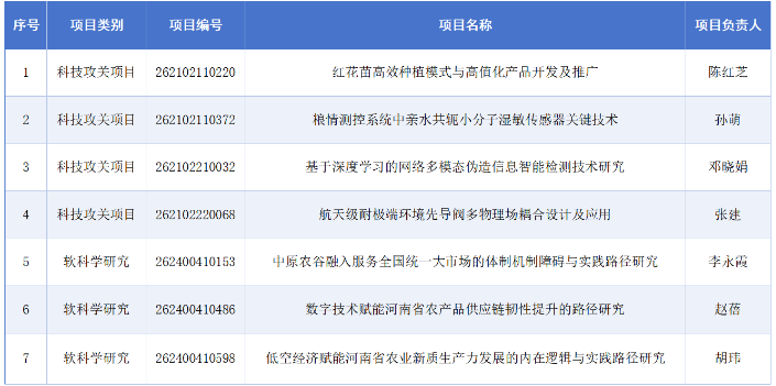 近日,河南省科学技术厅正式发布《关于下达河南省二O二六年科技发展计划的通知》(豫科〔2026〕20号),新乡工程学院共有7个项目获批立项。其中,包括“红花苗高效种植模式与高值化产品开发及推广”等4项河南省科技攻关项目,以及“中原农谷融入服务全国统一大市场的体制机制障碍与实践路径研究”等3项河南省软科学研究项目。