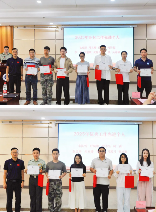 随后,张广金宣读了《关于表彰2025年征兵工作先进单位和个人的通报》,软件与人工智能学院、网络空间安全学院、数字经济与管理学院获评“征兵工作先进单位”,周戈燕等18位同志获评“征兵工作先进个人”。大会分批次为先进个人和先进单位颁发荣誉,刘友坤书记、张广金副书记分别为获奖代表颁奖,现场掌声热烈。