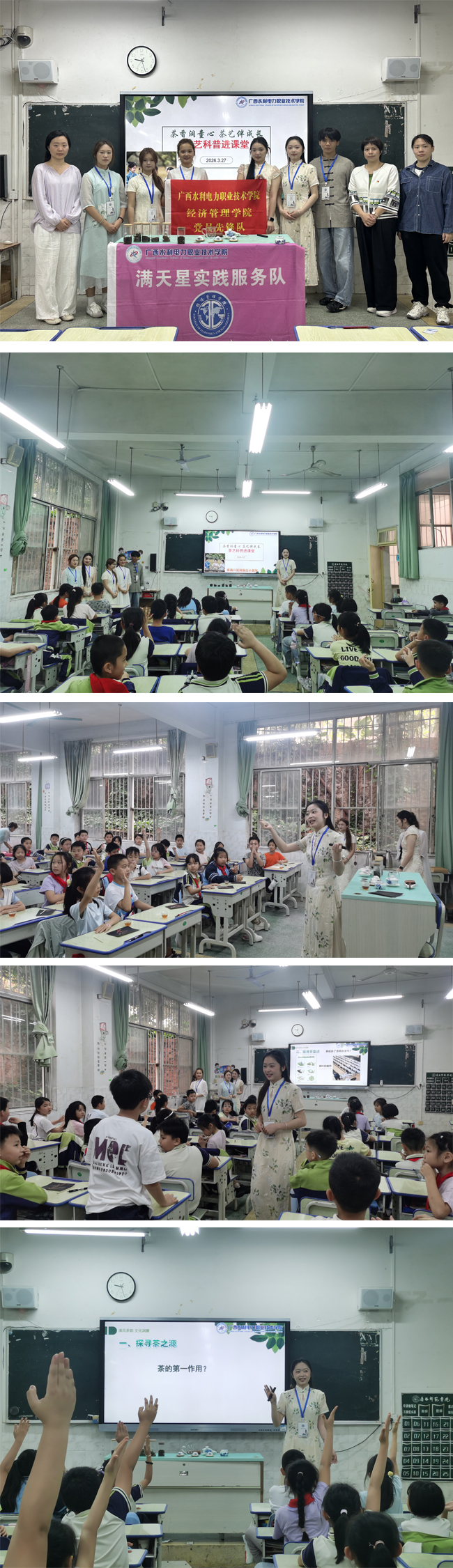 2026年3月27日,南宁师范大学附属实验学校的课堂茶香袅袅、童趣盎然。广西水利电力职业技术学院经济管理学院“双带头人”教师党支部书记“强国行”专项行动团队、学生党支部、学院团委联合茶艺协会,共同开展“茶香润童心 茶艺伴成长”茶艺科普进课堂志愿服务活动。学院党员教师、学生团员及青年学生积极参与,以茶为媒,将传统文化与志愿服务深度融合。