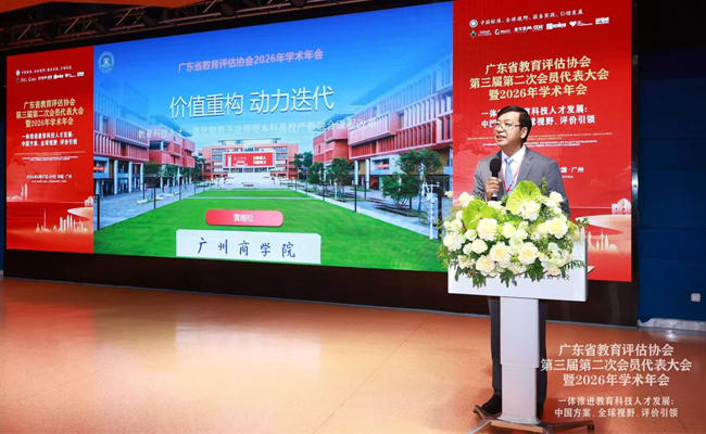 3月28日,广东省教育评估协会第三届第二次会员代表大会暨2026年学术年会在广州召开。大会汇聚全省120余所学校、教育机构及企业代表350余人参会,共同擘画广东教育高质量发展新蓝图。广州商学院执行校长、广东省教育评估协会副会长黄南松教授应邀参会,并在高等教育论坛上作主题报告。