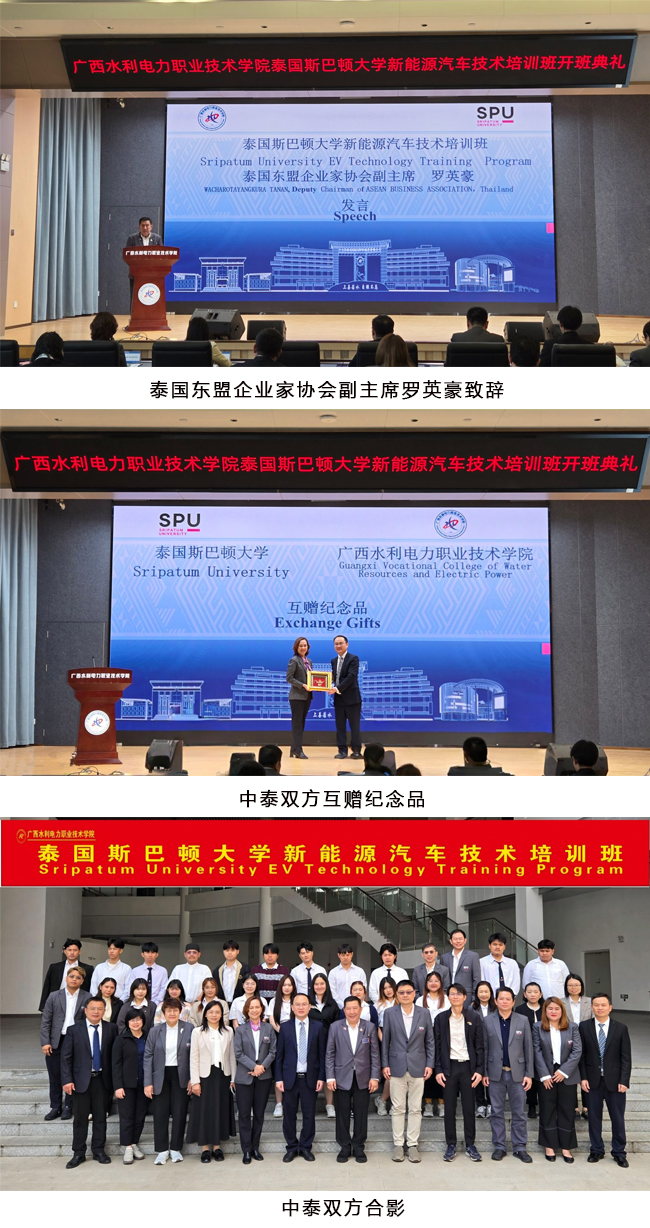 典礼上,双方互赠文化纪念品后正式开课,首堂课程围绕高压安全规范展开。期间,泰国电力局相关领导参观了广西水利电力职业技术学院电力实训场。此次培训搭建了中泰教育合作平台,为两国新能源汽车产业协同发展注入动力。