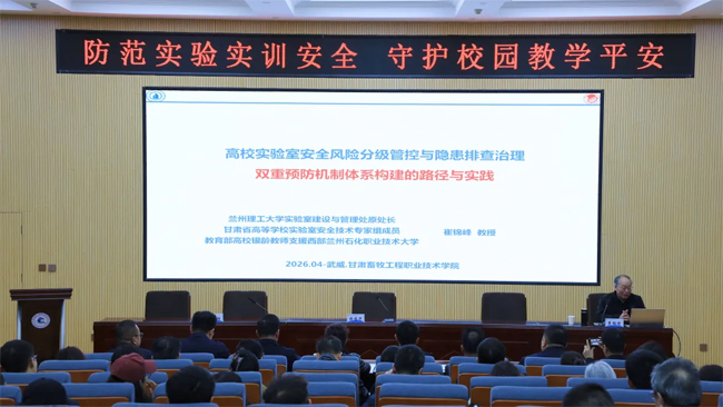 4月3日,甘肃畜牧工程职业技术学院组织开展实验实训室安全管理专题培训,特邀请兰州理工大学实验室建设与管理处原处长、教育部高校银龄教师、甘肃省高等学校实验室安全技术专家组成员崔锦峰教授作专题辅导。学院领导、各教学单位负责人、实验室与实训相关教职工共100余人参加了本次培训。
