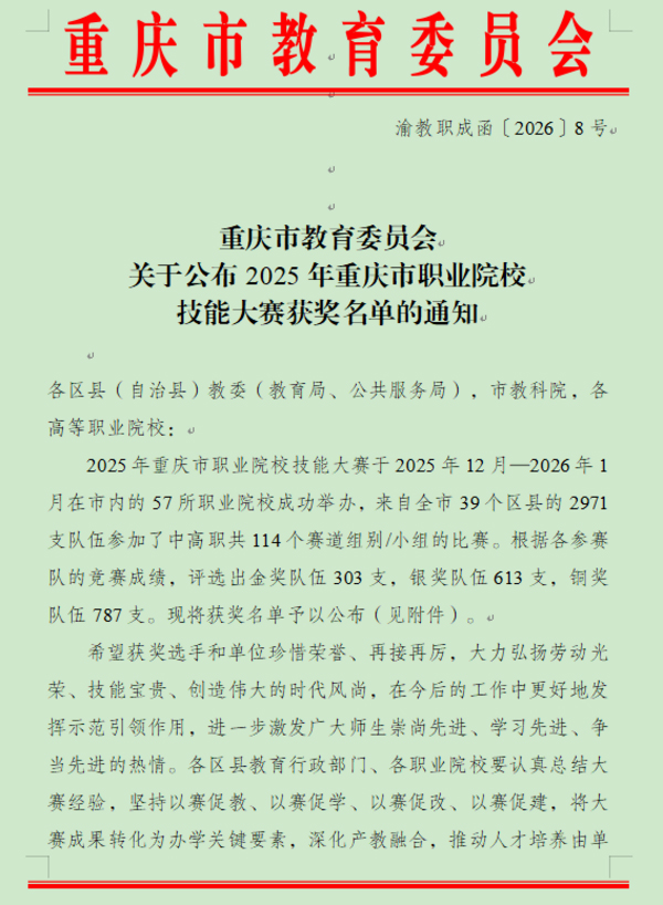 近日,重庆市教育委员会正式发布《关于公布2025年重庆市职业院校技能大赛获奖名单的通知》,通知明确重庆城市职业学院累计获奖70项,其中金奖22项、银奖29项,获奖率达77.78%,位居全市高职院校第二。与上一届相比,重庆城市职业学院金奖占获奖总数的比例由16.28%大幅提升至31.4%,金奖、银奖数量均位列全市第一(与其他院校并列),获奖数量与质量实现显著提升。