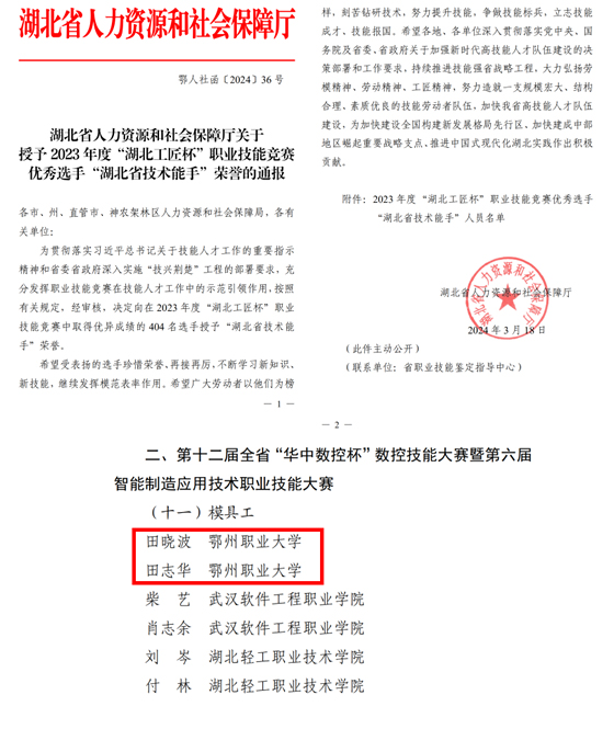 (通讯员 刘宏文)近日,湖北省人力资源和社会保障厅发布《关于授予2023年度“湖北工匠杯”职业技能竞赛优秀选手“湖北省技术能手”荣誉的通报》(鄂人社函〔2024〕36号),鄂州职业大学机械工程学院教师田志华、田晓波在模具工赛项中荣获第一名,被授予“湖北省技能能手”荣誉称号。