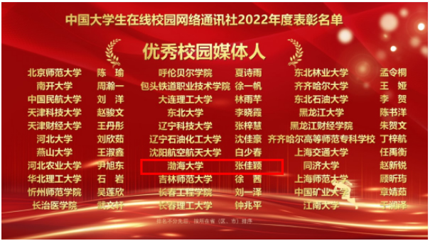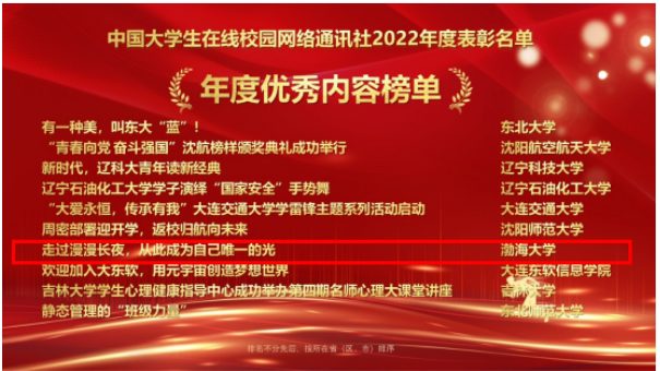 近日,教育部中国大学生在线发布2022年度校网通及校园行活动奖项名单,渤海大学获评“优秀校网通站”,党委宣传部张浩冬教师荣获“校网通优秀指导教师”称号,融媒体中心张佳颖同学荣获“优秀校园媒体人”称号,《走过漫漫长夜,从此成为自己唯一的光》作品入选年度优秀内容榜单。