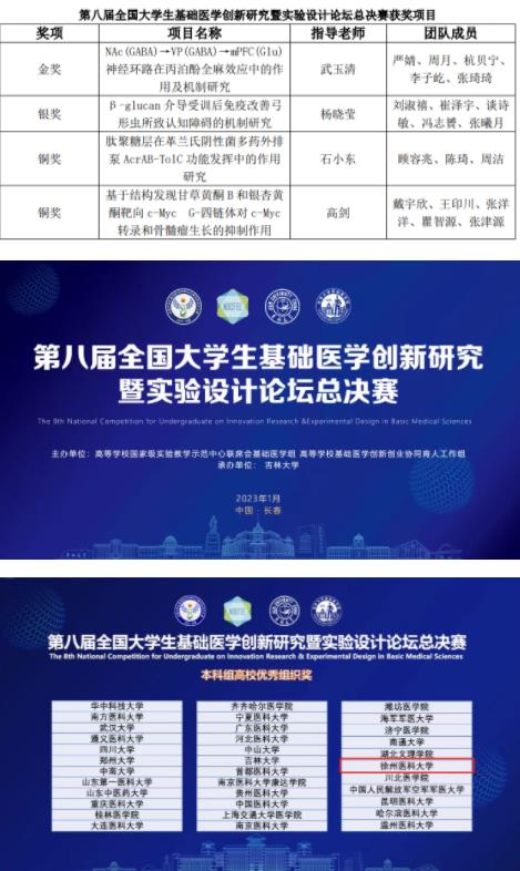 经过前期校内选拔、东部赛区复赛,徐州医科大学共有4个项目入围总决赛,入围项目全部获奖,获金奖1项、银奖1项、铜奖2项。其中,武玉清老师指导的项目获得金奖;杨晓莹老师指导的项目获得银奖;石小东、高剑老师指导的项目获得铜奖。因成绩突出,徐州医科大学荣获本次论坛本科组高校优秀组织奖。