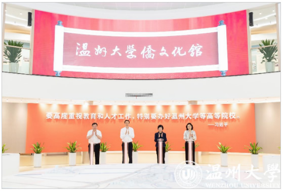 5月25日上午,温州大学侨文化馆开馆仪式隆重举行。浙江省侨联党组书记、主席庄莉萍,浙江省侨联经济科技部部长俞根君,浙江省侨联经济科技部四级调研员郑海光,温州市社科联主席潘晓勇,温州市侨联党组书记吴娜丽,温州市侨联主席南品仁,温州市发改委党委委员、副主任张天长,温州市侨联党组成员、秘书长陈晓军,温州市委网信办室务会成员、二级调研员蔡明才,温州市瓯海区侨联主席秦毅等省市领导,温州大学党委书记张健,副校长蔡曙光、潘玉驹等校领导出席开馆仪式。校长赵敏主持。