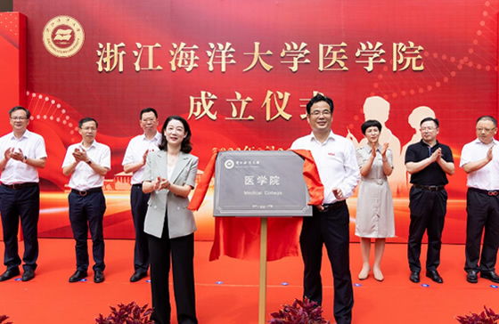 在浙江省委省政府、舟山市委市政府和社会各界的关心、支持下,浙江海洋大学顺利完成医学院筹建工作。6月21日上午,浙江海洋大学医学院成立仪式在定海校区实验大楼前举行。舟山市人民政府副市长洪碧和学校党委书记严小军共同为浙江海洋大学医学院揭牌。浙江中医药大学副校长吴承亮、宁波卫生职业技术学院党委书记刘秀丽等领导出席成立仪式。市委市政府相关单位负责人,兄弟高校、在舟医院代表,校友代表等参加成立仪式。