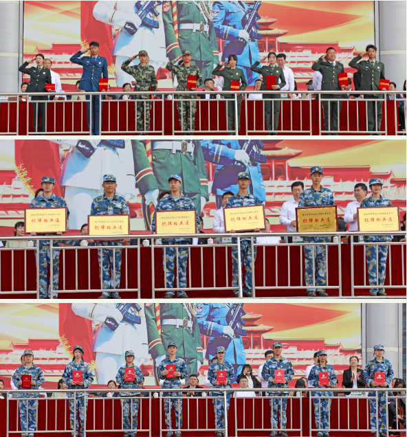 校领导为获得表彰的教官、连队及军训标兵代表颁发荣誉证书。
