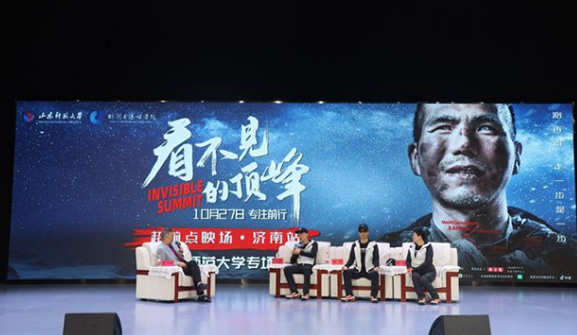 10月17日上午,电影《看不见的顶峰》专场电影暨主创见面会在山东师范大学长清湖校区文浚楼演播大厅举行。中国内地导演、制片人,北京欣欣向阳影视文化发展有限公司联合创始人范立欣,亚洲首位登顶珠峰的视障人士张洪,张洪的爱人、重要支持者夏琼出席见面会。新闻与传媒学院相关专业师生参加活动。新闻与传媒学院教授赵五洲主持见面会。