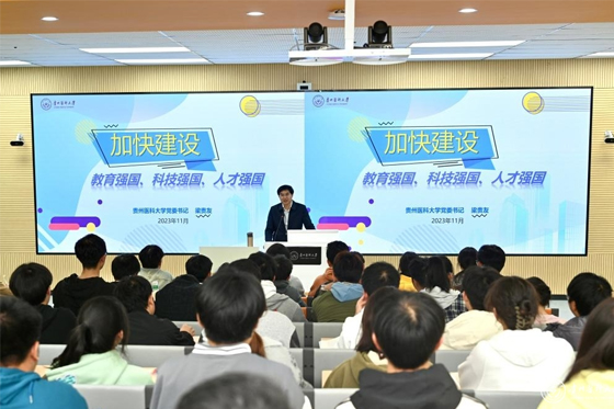 为深入学习宣传贯彻党的二十大精神,进一步加强大学生思想政治教育工作,11月8日晚,贵州医科大学党委书记梁贵友以“加快建设教育强国、科技强国、人才强国”为主题,在云漫湖校区临床组团R307S教室通过现场教学及云端课堂直播相结合的方式为2023级“协和班”、眼视光医学、口腔医学、基础医学、临床医学、妇幼保健医学等17个专业31个班级共2700余名学生讲授了一堂精彩纷呈的形势与政策课。