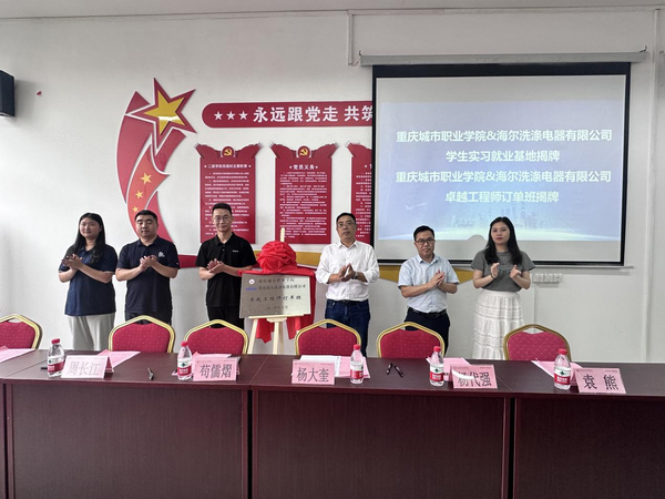6月26日下午,重庆城市职业学院信息与智能制造学院与重庆海尔洗涤电器有限公司在明华楼404举行学生实习就业基地揭牌仪式暨卓越工程师订单班签约仪式。重庆海尔洗碗机工厂制造部长苟儒熠,信息与智能制造学院副院长杨代强出席。信息与智能制造学院党总支书记、副院长杨大奎主持仪式。