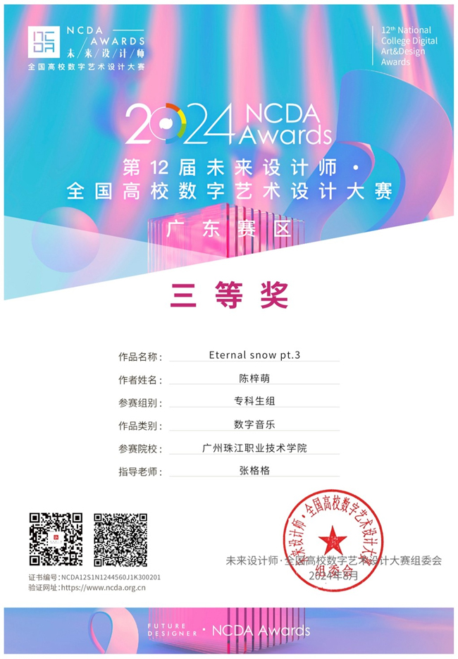 陈梓萌同学在此次比赛中展现出了非凡的毅力与专注。在音乐表演教研室主任张格格老师的悉心指导下,多次修改作品,不断突破自己,创作出数字音乐作品《Eternal Snow pt.3》。最终斩获广东、香港澳门赛区三等奖,为自己的拼搏历程画上了圆满的句号。