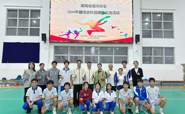 10月28日,湖南省毽球协会与湖南师范大学附属中学毽球队开展毽球进校园交流活动。湖南省毽球协会委员会主席骆先鸣,秘书长覃章晟亲临现场指导,湖南师范大学附属中学体育美育中心主任谭伟,毽球队教练李碧慧参与活动。