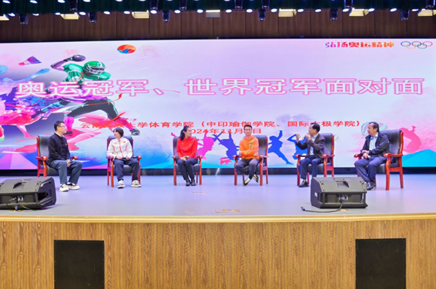 “奥运冠军、世界冠军面对面”活动由央视法制频道主持人王筱磊主持,邀请国家体育总局文化发展中心崔乐泉研究员和云南民族大学体育学院杨祥全院长作为嘉宾和民大学子一起现场交流。体育学院全体师生及相关学院师生代表参加了活动。(文 图:陈建民 责任编辑:左映龙)