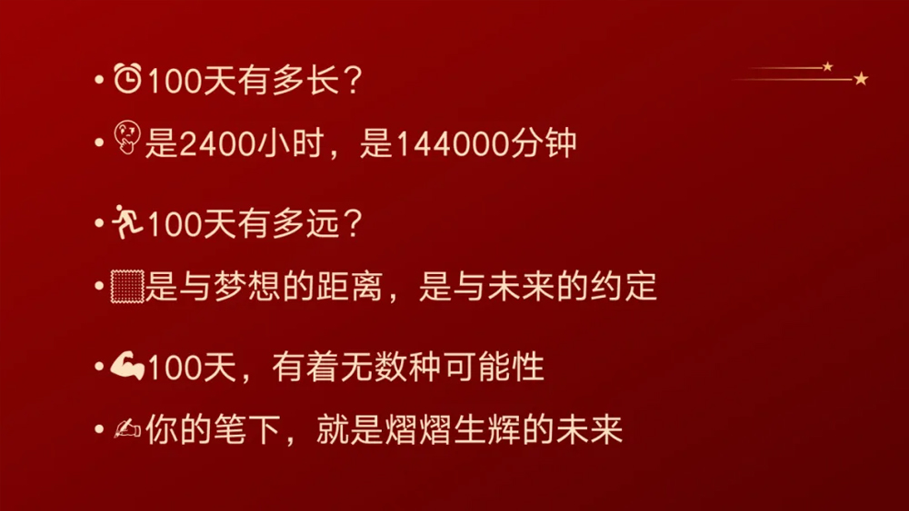 在老师们的带领下,同学们共同思考了“100天有多长”与“100天有多远”的问题。这100天,是2400小时的奋斗,是144000分钟的坚持,更是与梦想拉近距离、与未来许下约定的宝贵时光。同学们深刻认识到,这不仅仅是一个数字,更是他们人生中一个至关重要的转折点。
