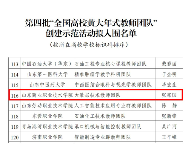 8月19日,教育部网站发布《关于第四批“全国高校黄大年式教师团队”创建示范活动拟入围名单的公示》,山东商业职业技术学院党委副书记、院长张宗国带领的大数据技术教师团队成功入选,这是学校师资队伍建设和学科发展的又一重要里程碑。