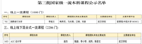 近日,教育部公布了第三批国家级一流本科课程认定结果的名单,武汉学院《消费者行为学》入选国家级线上一流课程,《ACC 会计学》入选国家级线上线下混合式一流课程。