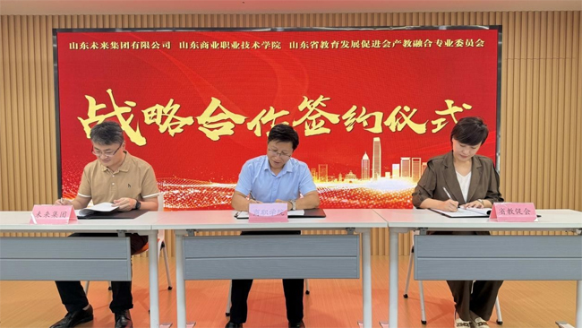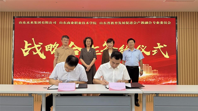 9月9日上午,山东商业职业技术学院与山东未来集团有限公司(以下简称“未来集团”)、山东省教育发展促进会产教融合专业委员会(以下简称“省教促会”)在山东未来云谷共同举办战略合作签约仪式。学校党委书记邓迎迎,党委副书记、院长张宗国,未来集团副总经理徐小传,省教促会秘书长刘晨曦等出席签约仪式。