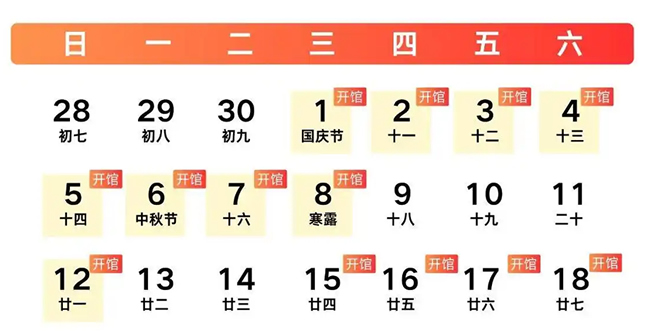 2025年10月1日至10月8日,开放时间由原9:00—17:00调整为9:00—18:00,17:30停止入场。