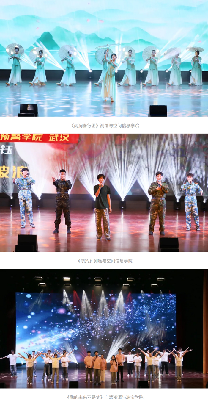 “是那山谷的风,吹动了我们的红旗;是那狂暴的雨,洗刷了我们的帐篷……”教工合唱团倾情献唱《勘探队员之歌》。铿锵有力的歌声,瞬间点燃了全场的豪情。这首饱含地质精神和奉献精神的歌曲,完美诠释了“奋进”的深刻内涵,激励着学子们要不畏艰难、披荆斩棘。