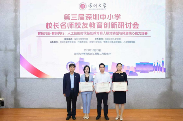 智教共生,育师先行。2025年10月25日下午,由深圳大学学生部指导,深圳大学人文学院主办,深圳大学教育学部、外国语学院、数学科学学院、物理与光电工程学院、人工智能学院共同协办的深圳大学第三届深圳中小学校长名师校友教育创新研讨会在深大召开。